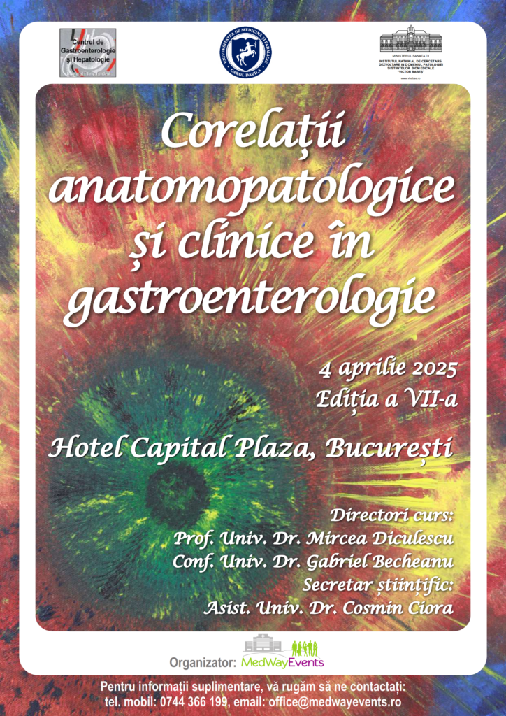 Avem plăcerea să vă invităm să participați la cea de-a șaptea ediție a cursului „Corelații anatomopatologice și clinice în gastroenterologie”, un eveniment de referință coordonat științific de domnii Prof. Univ. Dr. Mircea Diculescu și Conf. Univ. Dr. Gabriel Becheanu.