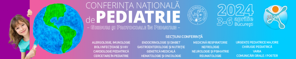 Avem plăcerea de a vă invita la Conferința Națională de Pediatrie, ce se va desfășura la București, în perioada 3‑6 aprilie 2024, eveniment organizat sub egida Societății Române de Pediatrie.